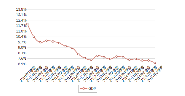 中國一季度國內生產總值140667億元,同比7%,增速創(chuàng)2009年以來6年新低。2014年來各季度GDP增長率分別為:7.4%、7.5%、7.3% 、7.3%,今年GDP增長目標為7%左右。